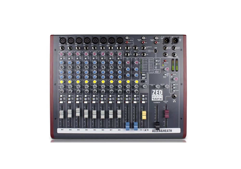 Allen & Heath ZED60-14FX — аналоговый микшерный пульт на 8 микрофонных/линейных входов. Имеет 2 стерео-входа, разъёмом USB и процессор эффектов.
