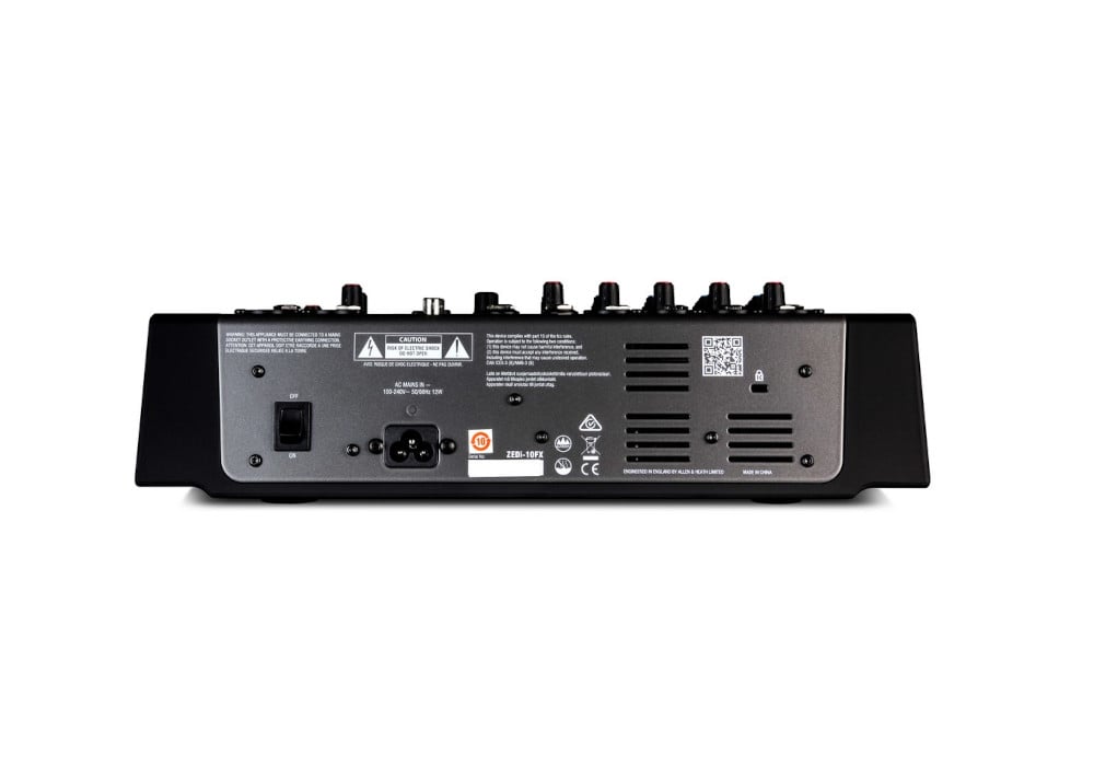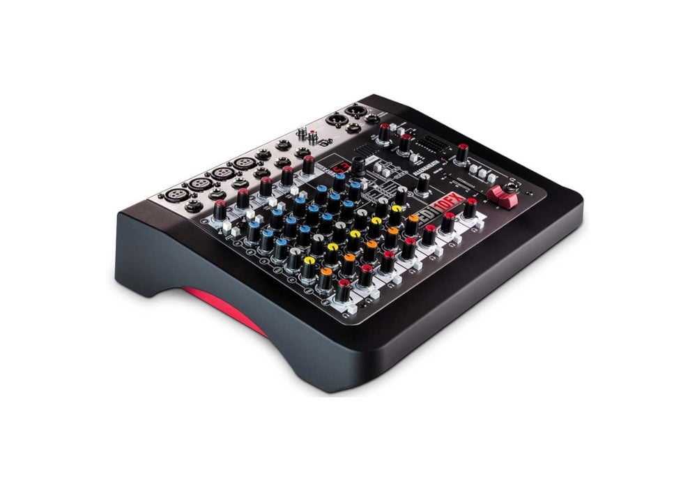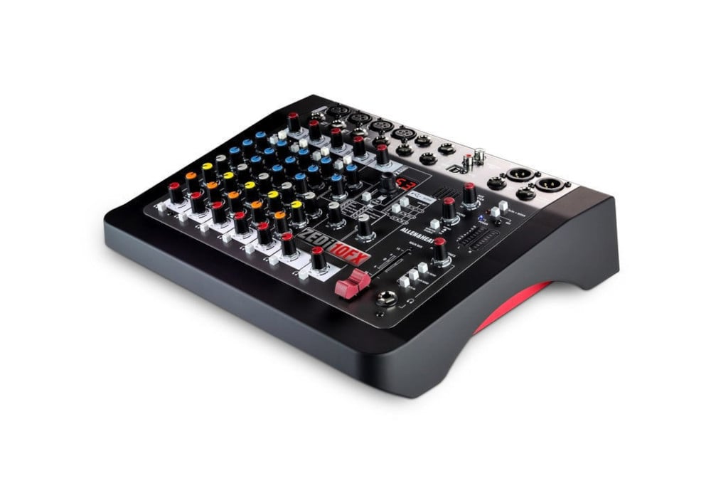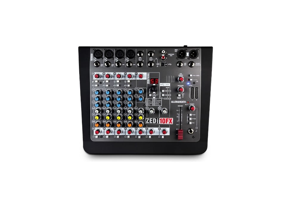 Allen & Heath ZEDi10FX — 10-канальный аналоговый микшерный пульт с 4 микрофонными/линейными входами, 2 переключаемыми входами Hi-Z. Имеет 2 стереоканала, 3-полосный эквалайзер, встроенные эффекты и USB-аудиоинтерфейс 4 х 4.