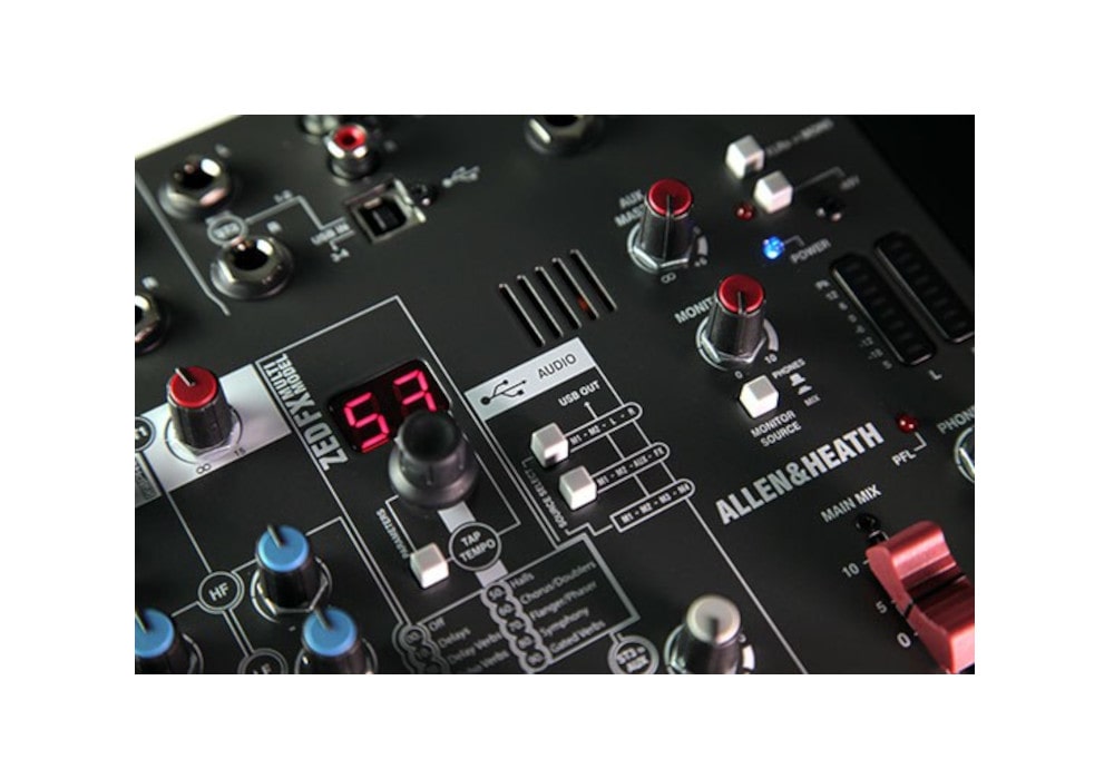 Благодаря подключению по USB 2.0, микшер Allen & Heath ZEDi10FX способен записывать и воспроизводить аудио с частотой 96 кГц/24 бит. Отдельные регуляторы для каналов воспроизведения USB-каналов позволяют добавлять аудио с компьютера в основной микс и AUX-микс по-отдельности.