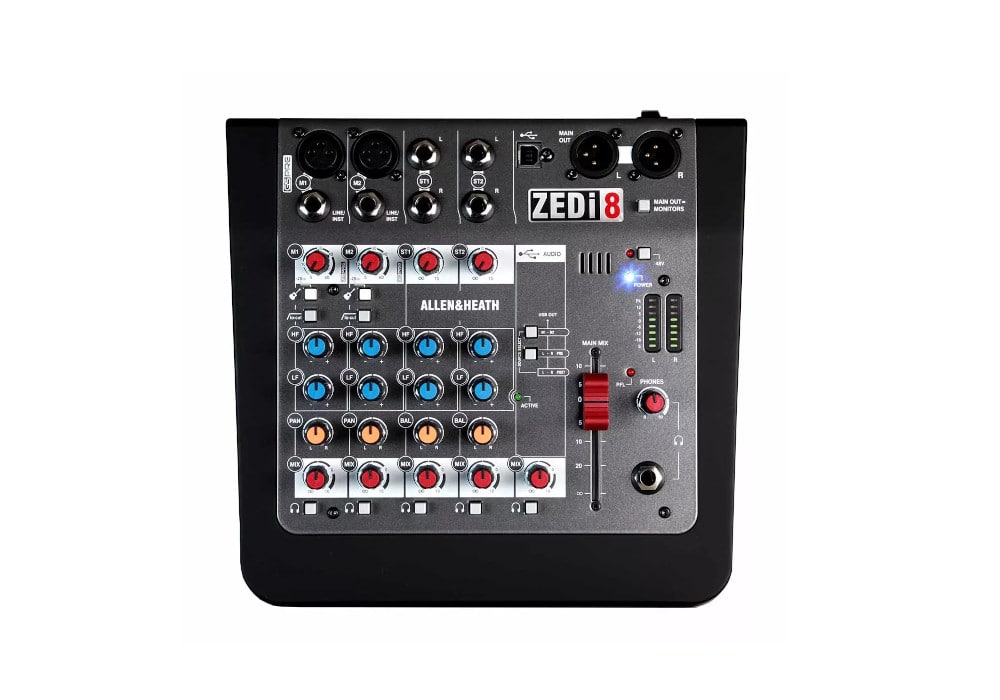 Allen & Heath ZEDi8 — 8-канальный аналоговый микшерный пульт с 2 микрофонными/линейными входами, 2 стерео каналами. Оснащен 2-полосными эквалайзерами и USB аудиоинтерфейсом 2 х 2.