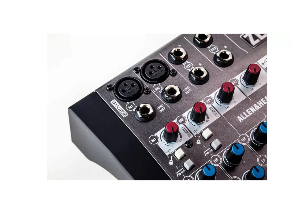 Для работы с музыкальными инструментами не нужны ди-боксы, как в других моделях. 2 потока имеют разъемы Hi-Z: одним нажатием подключаются электро или электроакустические инструменты. НЧ-фильтр используется для удаления лишних звуков и ненужных низких колебаний. Двухполосный эквалайзер поможет придать необходимую тональность треку.