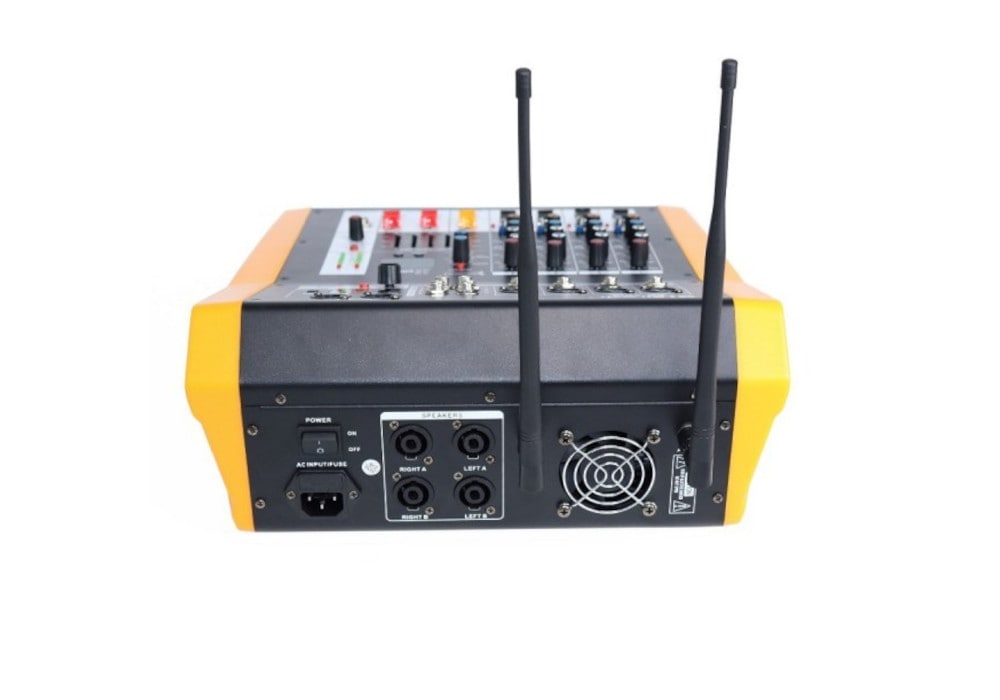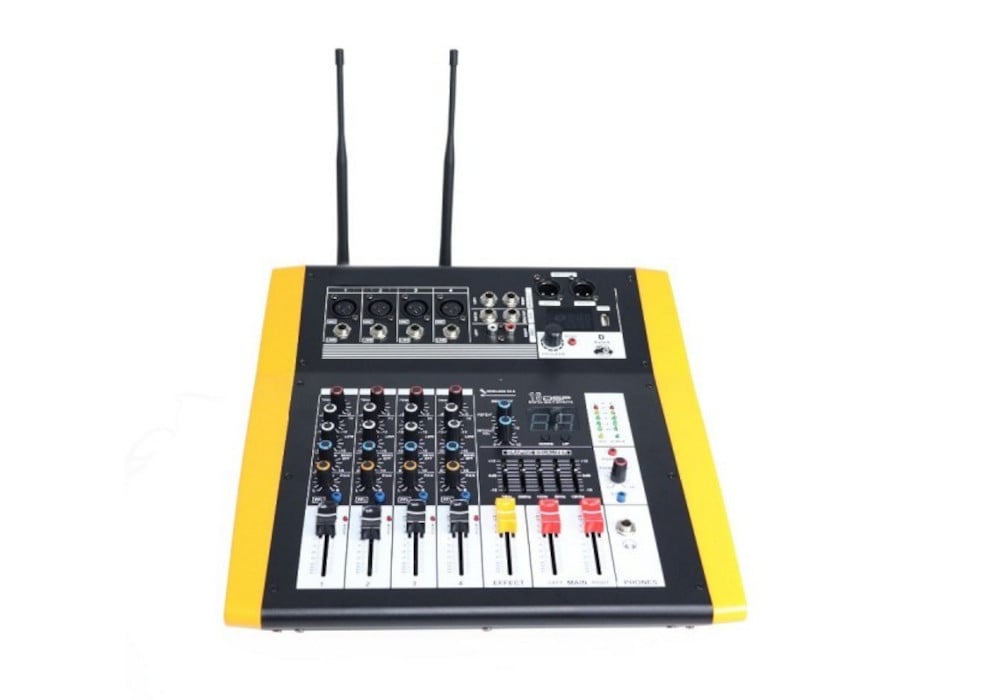 Biema LA-4 UHF — активный микшерный пульт с USB / SD / Bluetooth проигрывателем и двумя радиомикрофонами в комплекте. LA-4 UHF имеет встроенный усилитель мощности 250 Вт x 2 (4 Ом) и процессор эффектов. Этот микшер от Biema также обладает стерео 7-полосным графическим эквалайзером. Для всех каналов есть пиковая индикация сигнала и предварительный выбор монитора фейдера.