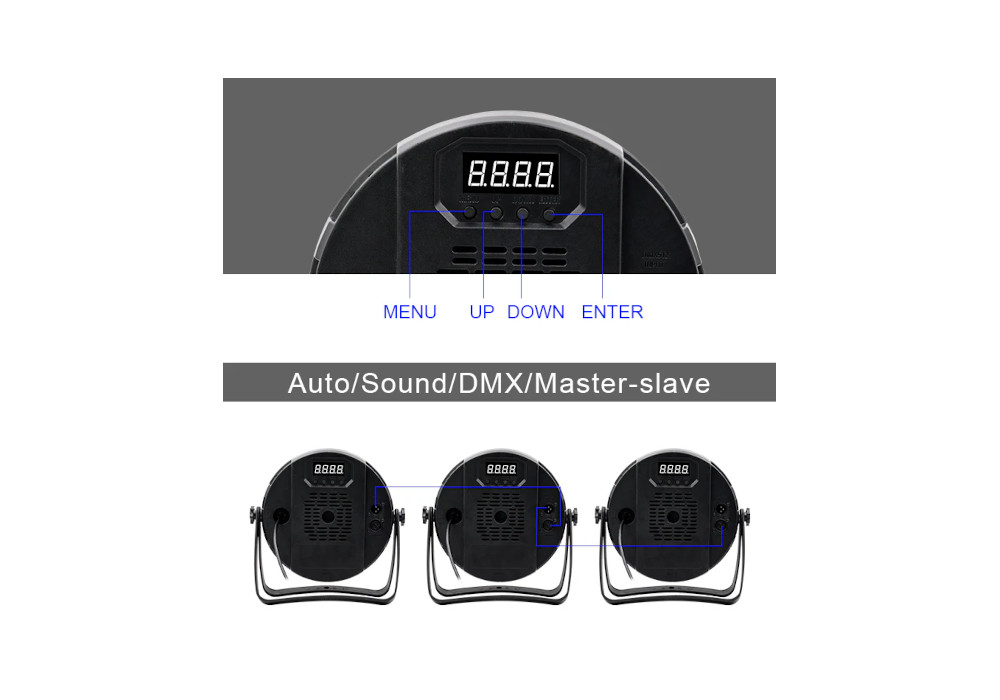 - Режим управления: Авто / Звук / DMX / Ведущий-ведомый