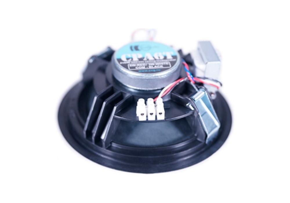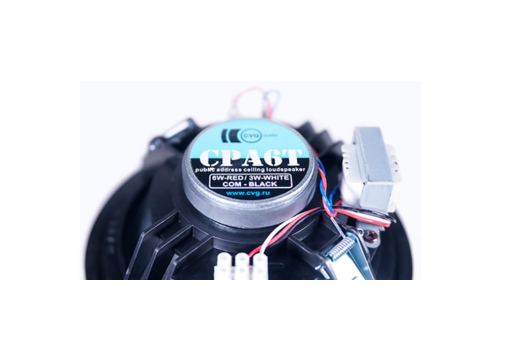 CVGaudio CPA6TBL предназначен для работы в составе трансляционных 100V линий. Имеет установленный с обратной стороны корпуса качественный согласующий трансформатор с отводами двух различных мощностей — 3 и 6W. Спикерный кабель подключается к акустической системе с помощью кабельного терминала с надежным винтовым зажимом. Выбор используемой мощности осуществляется при подключении спикерного кабеля. Кабель фиксируется в зажиме соответствующем необходимой мощности. Всего в кабельном терминале три зажима – СОМ(-), 3W(+) и 6W(+). Диффузор динамика изготовлен из целлюлозы высокой плотности. Корпус — из качественного ABS пластика, стойкого к воздействию солнечного света и пыли. Диффузор закрыт декоративной металлической сеткой. Цвет корпуса и декоративной сетки — черный.