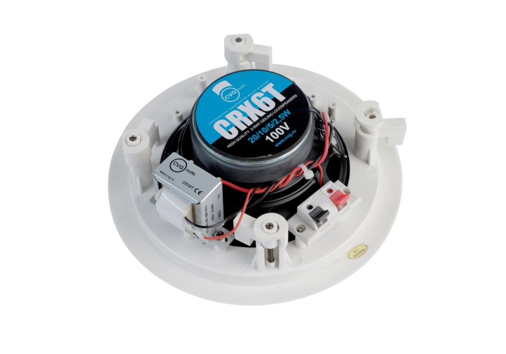 CVGaudio CRX6T – двухполосный потолочный громкоговоритель из среднеценовой линейки акустических систем CRX business line. Громкоговоритель выполнен в фирменном стиле, имеет компактные габариты и маленький вес.