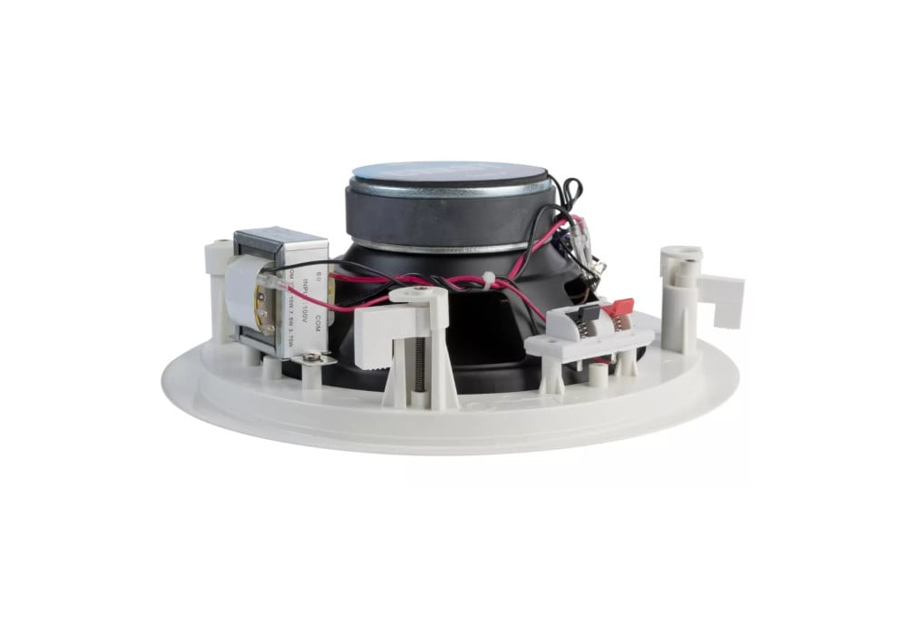 Корпус акустической системы оснащен зажимами, которые фиксируются с помощью винтов с метрической резьбой. Данный крепеж позволяет быстро и без проблем установить динамик в подвесной потолок толщиной от 5 до 30мм. Спикерный кабель подключается к акустической системе с помощью самозажимного кабельного терминала. Это существенно упрощает инсталляцию.