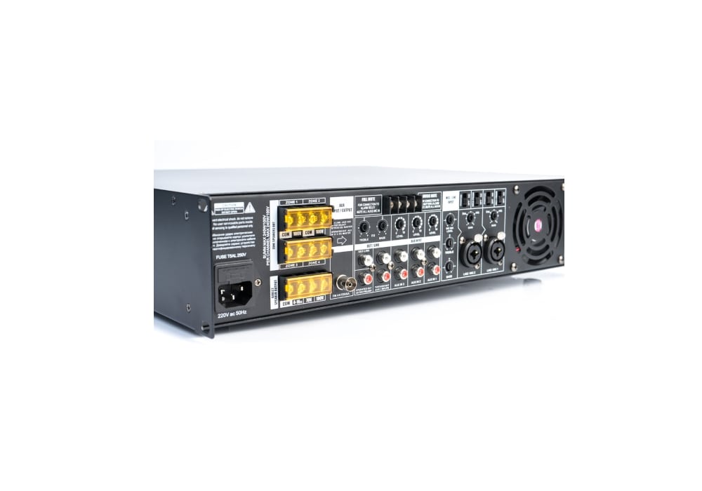 - Speaker output 70V/100V/4-16ohm (базовый формат использования — 100V), 4 on/off спикерных зоны с индивидуальной настройкой громкости только для 100V подключения)