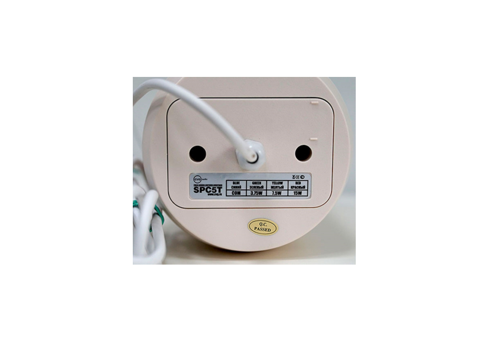 Акустическая система CVGaudio SPC5T может работать только в составе 100V трансляционных линий. Имеет установленный внутри корпуса 100V согласующий трансформатор и может быть подключена на одну из трех доступных мощностей — 3,75/7,5/15W в режиме 100V. Для подключения на 3,75W используются проводники COM (черный) и 3,75W (зеленый), желтый и красный раздельно изолируются. При подключении на 7,5W используются проводники COM (черный) и 7,5W (желтый), зеленый и красный раздельно изолируются. Подключая на 15W, используют проводники COM (черный) и 15W (красный), зеленый и желтый раздельно изолируются. Низкоомного подключения в данной модели не предусмотрено.