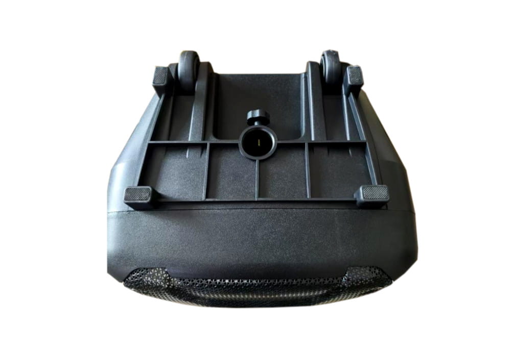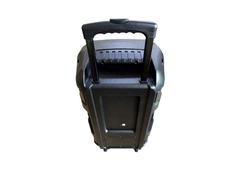 В корпусе этой многофункциональной колонки есть стакан для установки на стандартную акустическую стойку диаметром 35 мм. Для удобства перемещения предусмотрены колёса и выдвижная ручка.