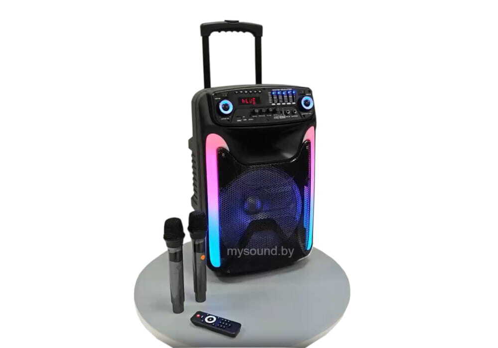 Система отличается наглядной и интуитивно понятной панелью с регуляторами параметров звука микрофона и музыки. Стоит отметить регулируемую функцию приоритета микрофона, а также отдельную регулировку громкости, частотной характеристики и эффекта «эхо» (echo) для микрофона. Устройство оснащено модулем DSP / USB / MP3 / FM / Bluetooth. Кроме того, есть пульт дистанционного управления.