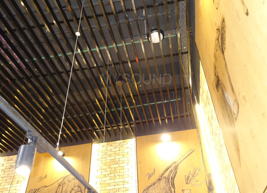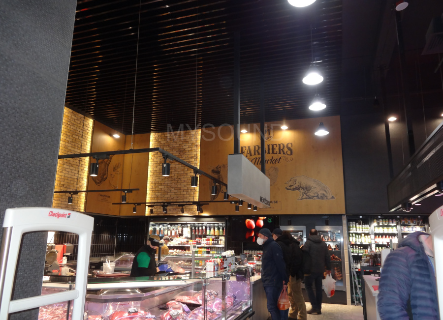 В магазине элитных мясных изделий и алкогольных напитков нужно было реализовать систему фоновой музыки. В уже работающем торговом объекте с полностью завершенной отделкой, заполненными витринами смонтированы акустические системы.