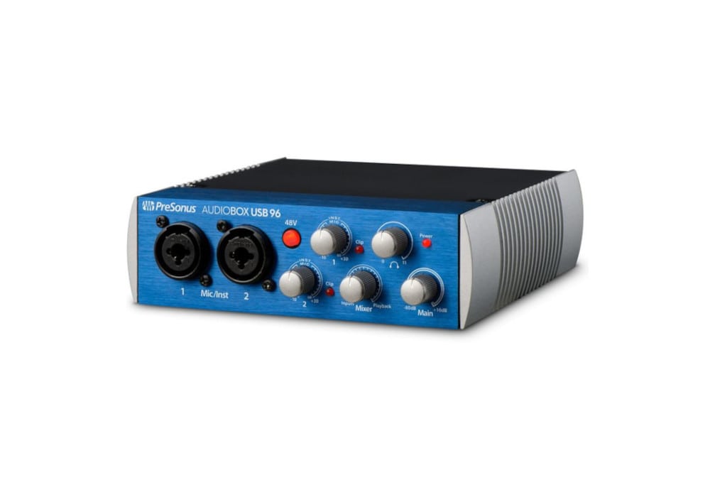 PreSonus AudioBox USB 96 представляет собой звуковую карту, подключаемую к ПК по USB 2.0. Компактный интерфейс оснащен 24-битными конвертерами с частотой дискретизации в 44.1, 48, 88.1 или 96 кГц. Для подключения микрофона/инструментов есть комбинированные разъемы с фирменными микрофонными предусилителями с возможностью подачи фантомного питания + 48В. Для большей универсальности использования AudioBox USB 96 оснащен входом/выходом MIDI. Во время записи можно проводить мониторинг трека без задержек. Кноб Mixer поможет смешать сигнал, поступающий с предусилителей, с сигналом DAW. Тем самым можно добиться баланса между 2 этими источниками.