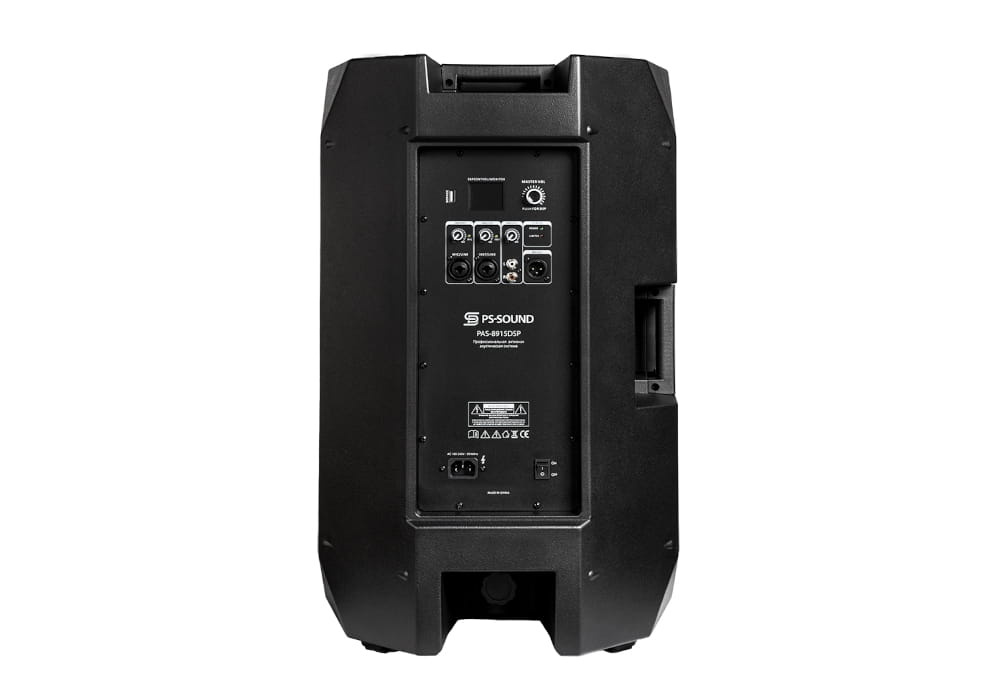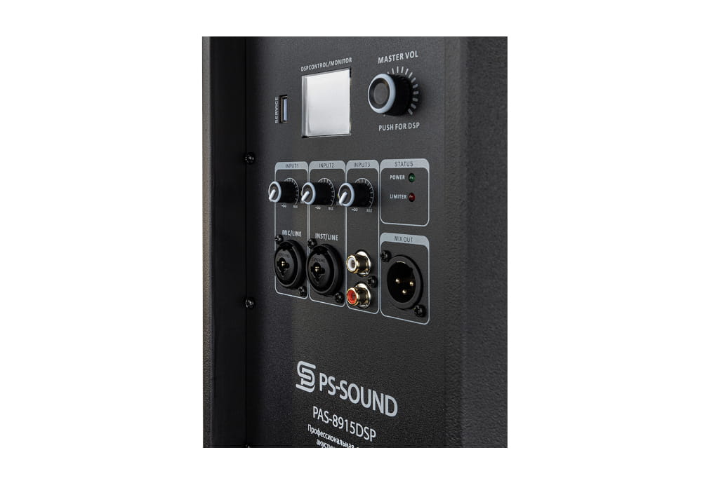 PS-SOUND PAS-8915DSP — профессиональная 2-полосная активная акустическая система мощностью 400 Вт RMS и 800 Вт пиковая. В основе PAS-8915DSP — 15″ низкочастотный динамик и 4,5″ высокочастотный драйвер. Данная модель от PS-SOUND обладает встроенной системой управления сигналом (DSP) с графическим дисплеем. Это значит, что можно выбрать из нескольких предустановок наиболее подходящую под конкретное мероприятие и акустические условия.
