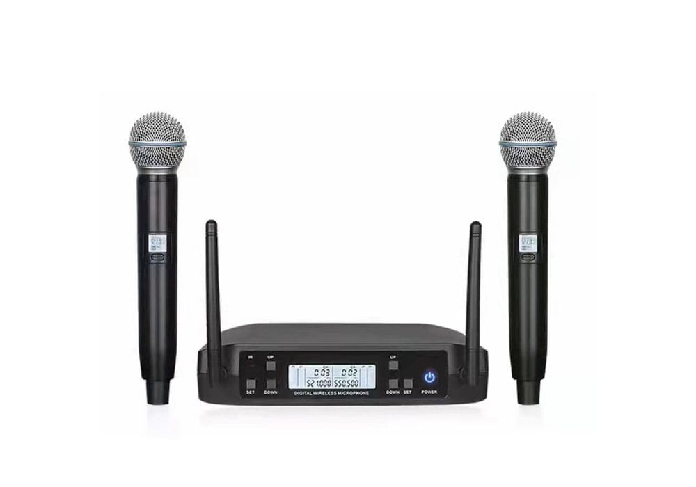 Двухканальная радиосистема с 2 ручными передатчиками. Информационные дисплеи на корпусе микрофонов и базе. Материал пластик. Цвет черный.