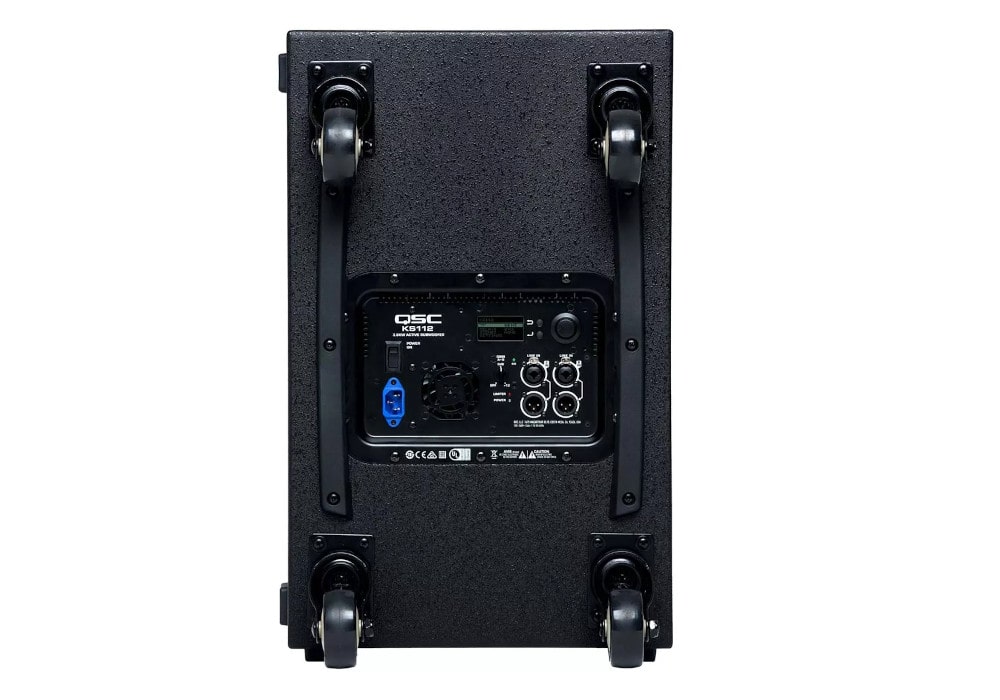 На задней панели QSC KS112 модуль управления с LCD-дисплеем для настройки кроссовера, вызова/сохранения сцен, настройкой Intrinsic Correction и управлением полноценной акустической системой. Имеется 2 комбинированных входа XLR/TRS и 2 сквозных выхода XLR. В комплект поставки включен кабель питания с замком и 4 прочных низкошумных колеса.