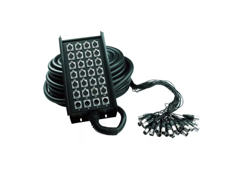 Soundking AH106 50m — мультикор (мультикабель) с раздаточной сценической коробкой на 24 x 4 XLR-разъёма — 20 «мама», 4 «папа». Длина мультикора 50 метров. Цвет чёрный. AH106 50m применяют для возможности установки микшерного пульта на удалении от сцены.